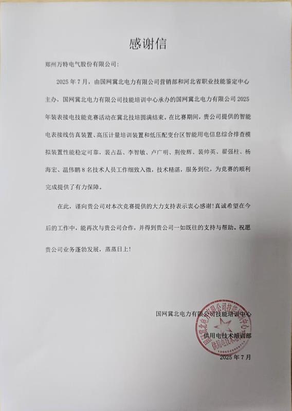 在剛剛結束的國網河南電力裝表接電及反竊電技能競賽和國網冀北電力聯合河北省職業技能鑒定中心主辦的裝表接電賽事中,面對分布式能源安裝、線損分析等復雜場景,公司設備全程穩定運行,為大賽順利進行提供了關鍵技術保障??蛻舴謩e在感謝信中強調,我司派遣的技術人員“細致入微,技術精湛,服務到位”、“堅守崗位,保障賽事零故障”。